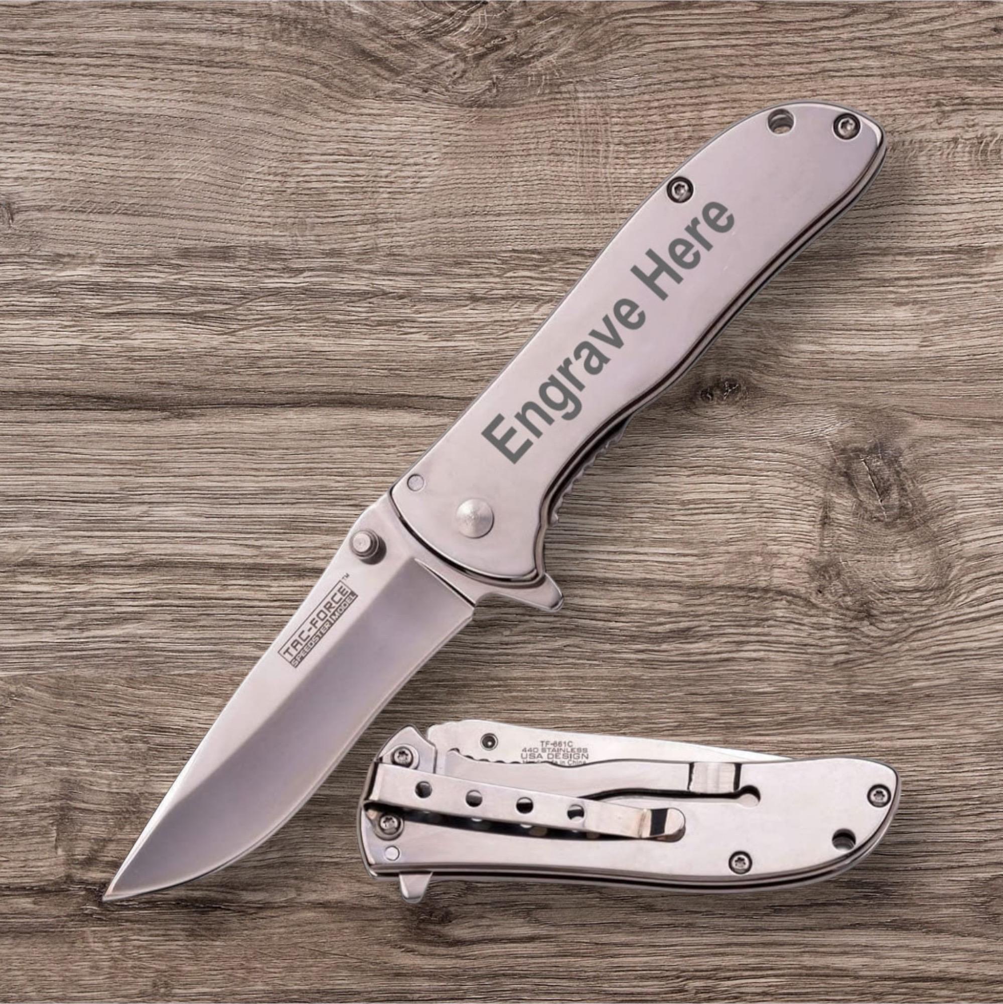 Custom Free Engraving Handle Tac-Force Spring Assisted Pocket Silver Brushed Knife , Great for Outdoor, Fishing, Hunting , Hiking , Sports , Groomsmen gift
